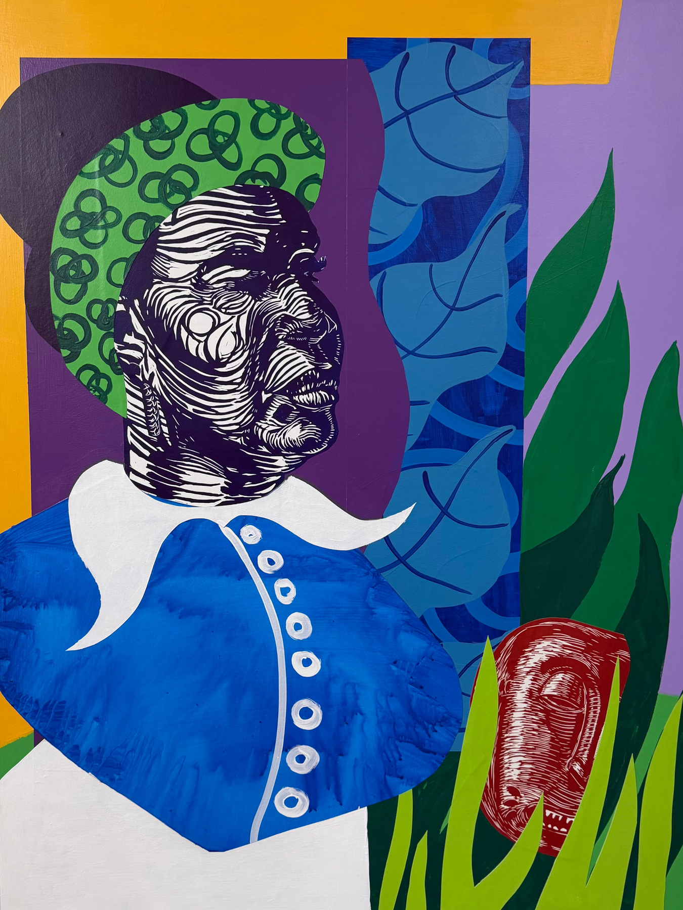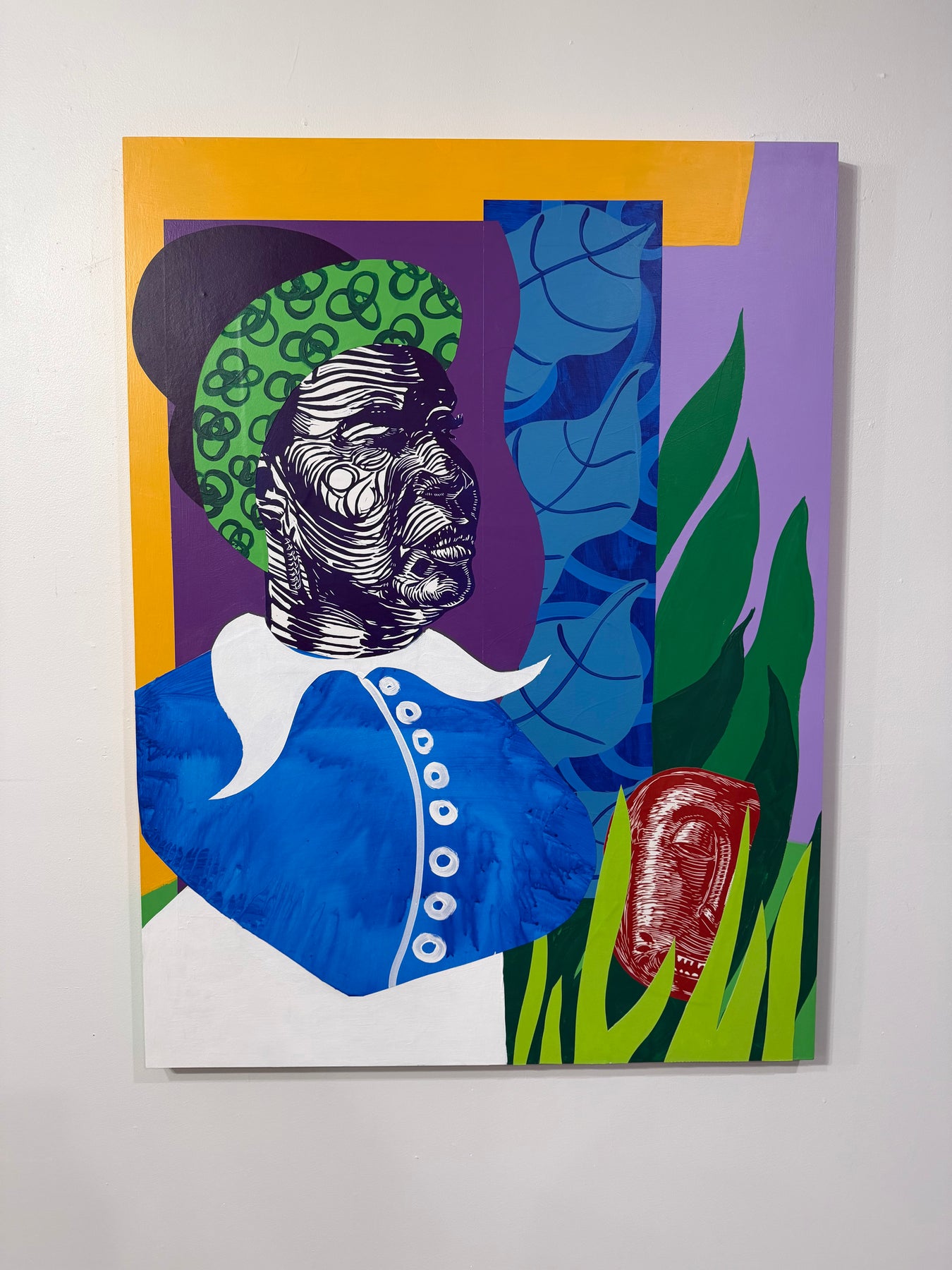 36 x 48 inches, mixed media, woodcut collage, acrylic on canvas (2025)-- unframed