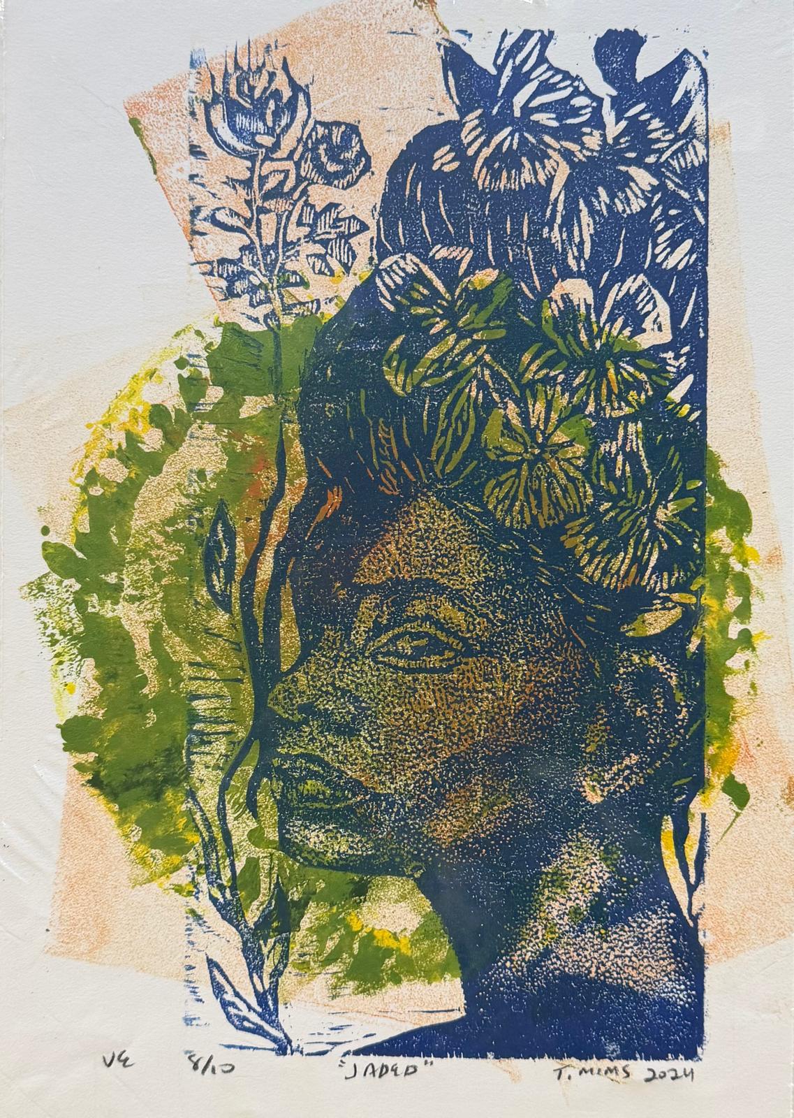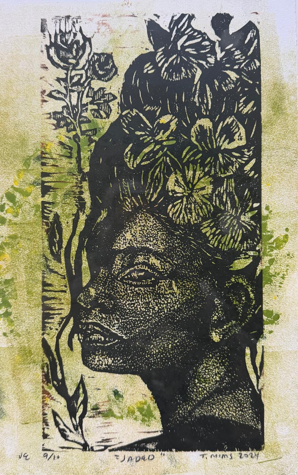 Traci Mims is a native of St. Petersburg, Florida currently living and working in the Atlanta Georgia area. She says “Art has always been a part of my life. I have been drawing since the age of 4 after watching my father draw portraits.” Her main focus is on creating portraits that are thought provoking. About the meaning and content of her work she states “My work focuses on themes related to Black identity and being a black woman in todays cultural and political climate. I also like to focus on historical narratives and individuals. My ideas are often expressed in the form of cultural allegory and social realism. I am motivated by art that has an underlying message that engages the viewer in a way they can relate to. Art for me is many things but mainly it is my passion and my voice when I have a statement to make. It has also been my protest when circumstances of injustice arise. I never grow weary creating only resentful that there is not more time in a day to print, draw or paint.” Ms. Mims is formally trained in the visual arts with degrees from Florida A and M university (BA)and Tyler school of art, Temple university(MFA).