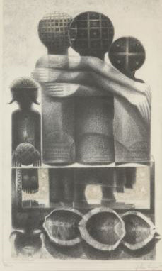 John Thomas Biggers (1924-2001) was one of the most significant African American artists of the twentieth century. He was known for his murals, but also for his drawings, paintings, and lithographs, and was honored by a major traveling retrospective exhibition from 1995 to 1997. He created archetypal imagery that spoke positively to the rich and varied ethnic heritage of African Americans, long before the Civil Rights era drew attention to their African cultural roots.